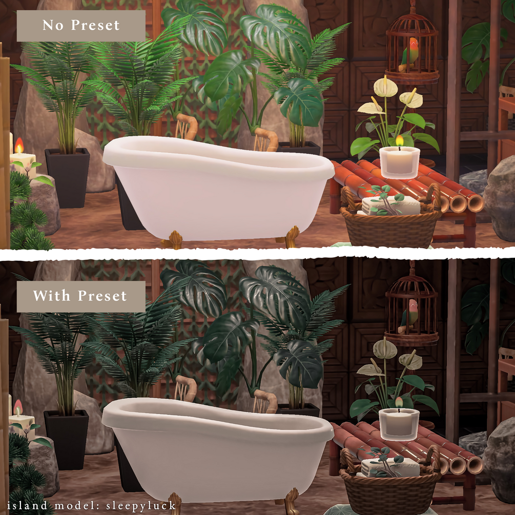 Based on one of my islands, "Sleepytown" is a Mobile Lightroom Preset that turns Animal Crossing screenshots into a lush forest getaway. Designed to create the perfect 'forest town' aesthetic I wanted for my Sleepytown screenshots, you can now recreate this aesthetic for your own screenshots using this preset!