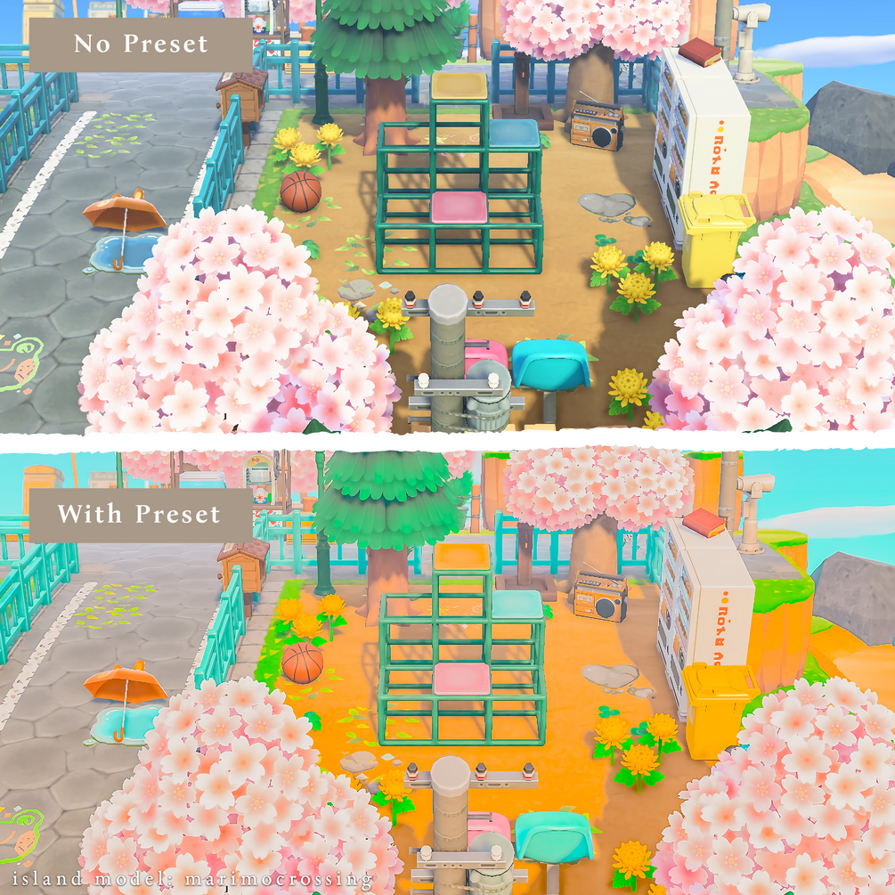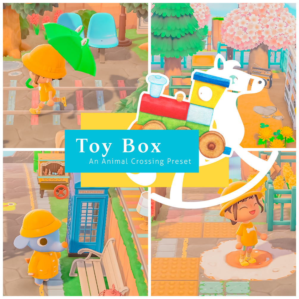 Inspired by the 'kidcore' aesthetic, "Toy Box" is a Mobile Lightroom Preset that emphasises the bright & cheery aspects of Animal Crossing screenshots. This preset saturates and brightens many of the colours, giving screenshots a childhood nostalgia feel! Personally, these colours remind me of playing old PS1 games like Spyro or Crash Bandicoot when I was a kid! I hope they give you a similar warm feeling.